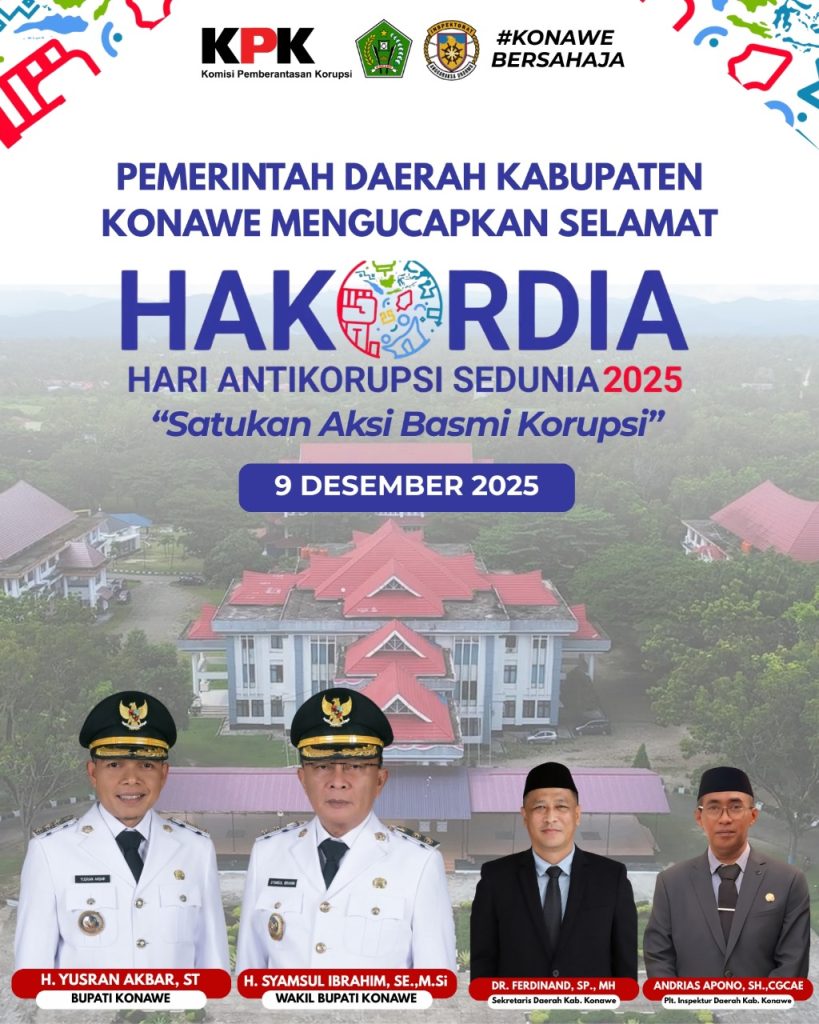 UNAAHA – Pemerintah Daerah Kabupaten Konawe menunjukkan dukungan penuh terhadap pelaksanaan Hari Anti Korupsi Sedunia (Hakordia) Tahun 2025. Peringatan yang jatuh setiap tanggal 9 Desember ini menjadi momentum krusial bagi Pemkab Konawe di bawah kepemimpinan Bupati Yusran Akbar dan Wakil Bupati Syamsul Ibrahim untuk memperkuat tata kelola pemerintahan yang bersih, transparan, dan akuntabel.